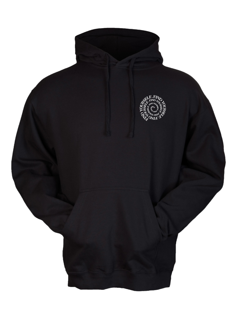 An 80% cotton, 20% polyester hoodie with the TMG maze logo on the back and our guiding spiral with the phrase "find yourself" on the front.